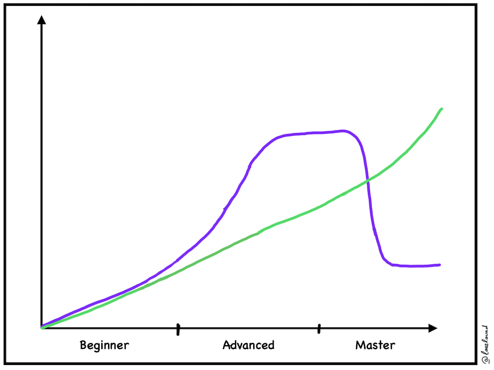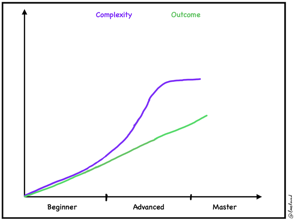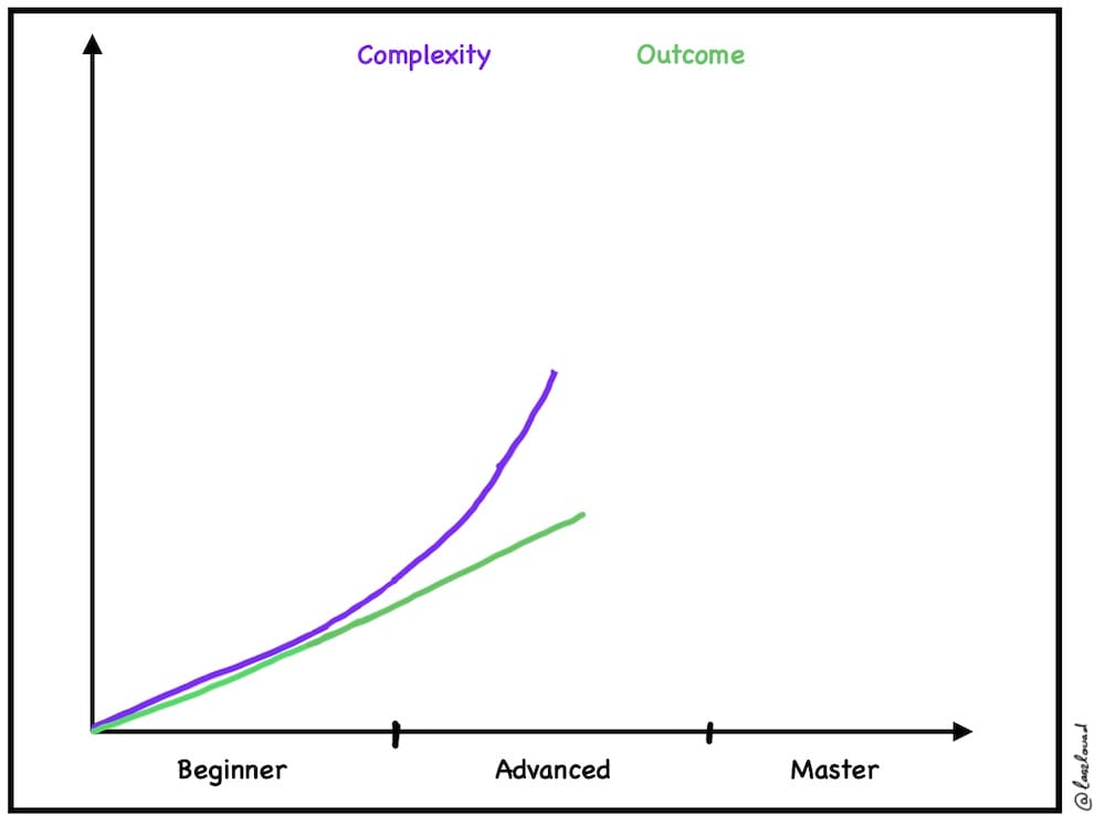 You start to like your outcomes but also begin to chafe against the time and resources you need to spend to achieve them. Your complexity increases exponentially, while your outcomes follow only linearly:
